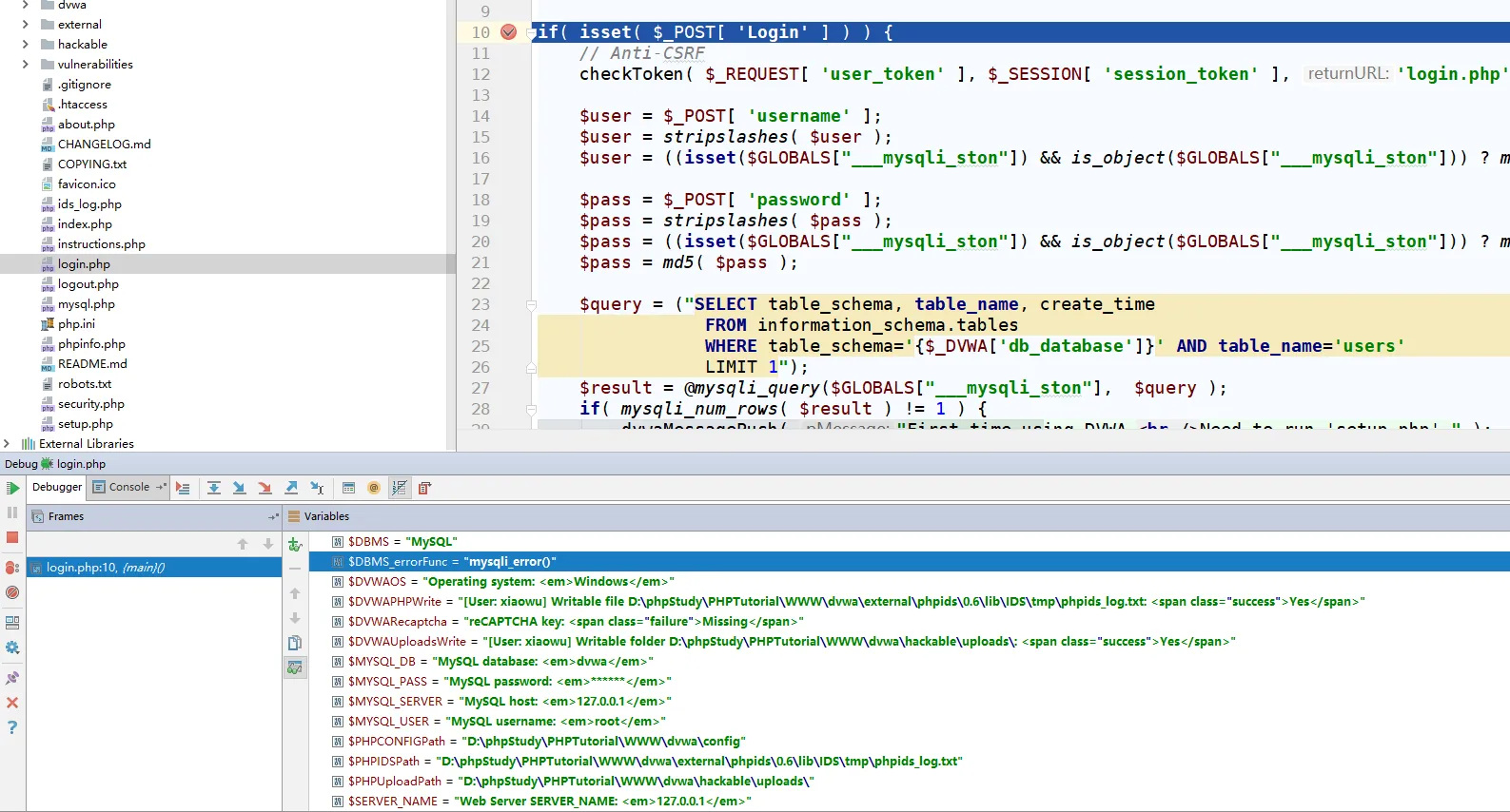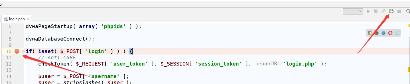 这里我用dvwa来测试,我们先打开火狐xdebug-ext,然后打开phpstorm的debug模式,然后随便下个断点: