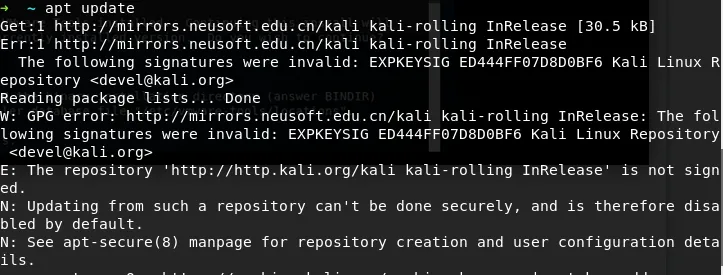 然后去百度了一下,参考了大神给出的方案,重新添加kali的数字签名: https://blog.csdn.net/hardhard123/article/details/79598132