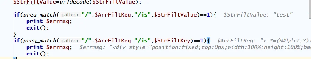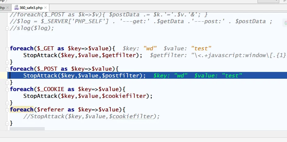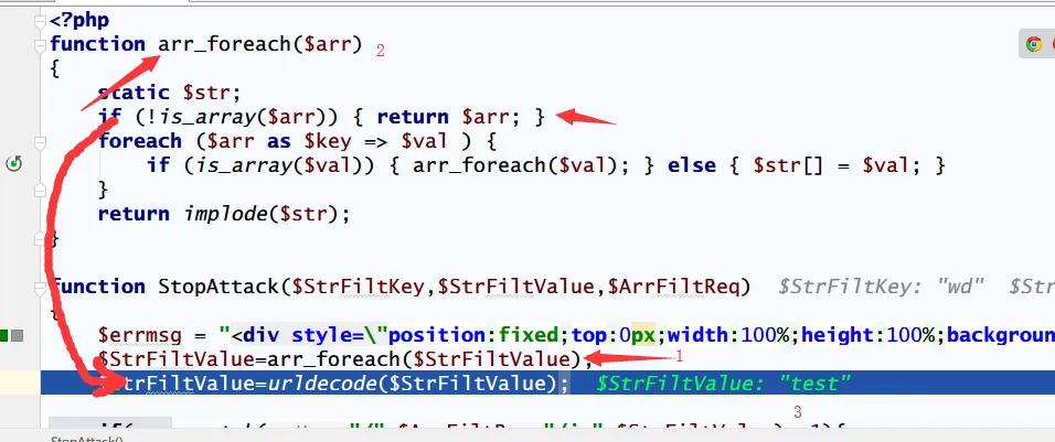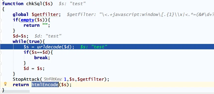在这里会经过urldecode函数的解码,一直循环到不能解码为止,然后经过刚才的StopAttack方法的过滤