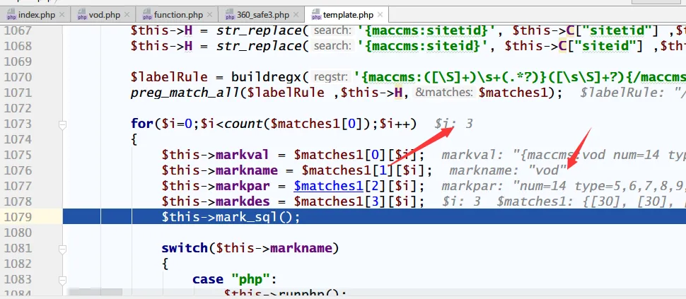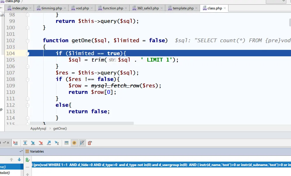 vod.php文件后F8走到这里,F7进去看SQL执行的过程。