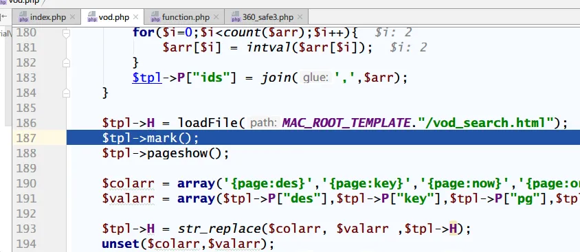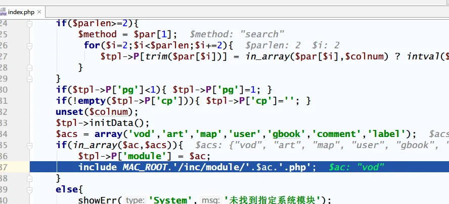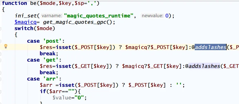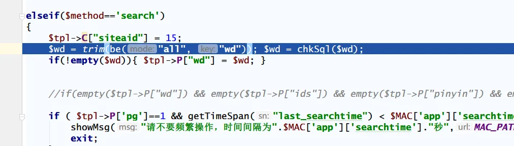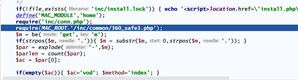 $m = be('get','m');这里,这里只是对m传过来的vod-search进行addslashes函数的过滤