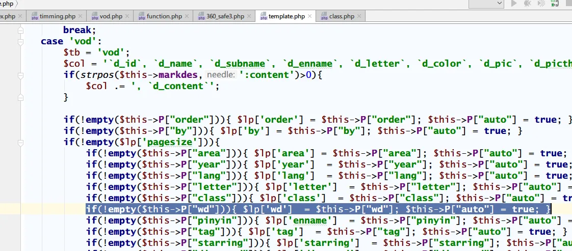 inc/common/template.php,可以看到传过来的P["wd"]值赋值给了$lp['wd']。