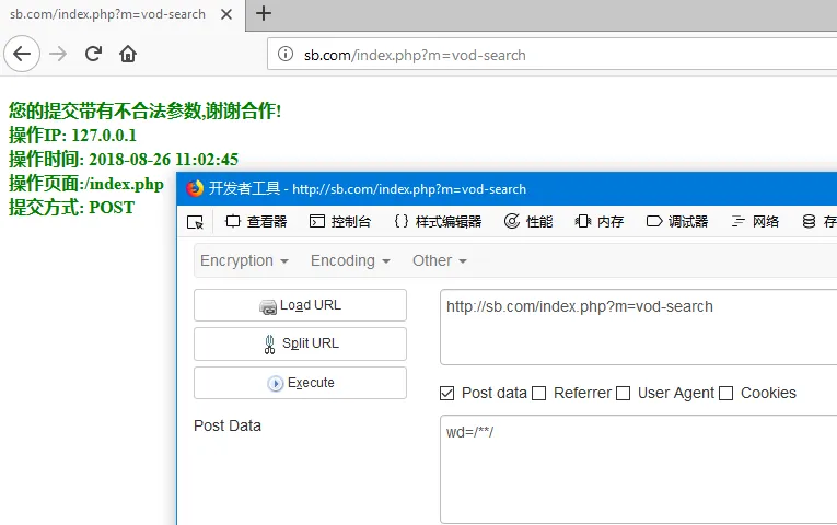 最后分别对传过来的wd和test两个值进行匹配,如果存在拦截规则里面的字符就跳转到错误信息。