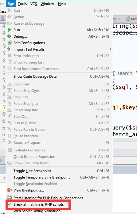 - phpstorm打开这个选项,意思就是断在当前脚本文件的第一行,我就不下断点了,跟着它执行的过程走一遍。
