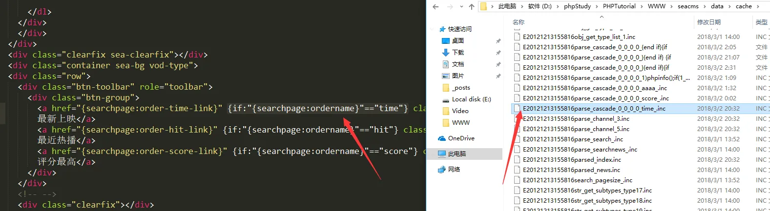 Payload的里面一个重要的参数$searchtype的代码,一定要赋值5,可以到看到等于5的时候就有$order变量,所以我们要传$order进去就赋值5,至于为什么要赋值给$order,先跟着代码执行下去自然就会明白了。 这里还有一个点,就是第四行的$pSize这里是选择模版文件,就是为了接下来使用str_replace函数对这个模版文件的内容进行替换。 替换内容的文件在\data\cache里面,下面是文件的位置。