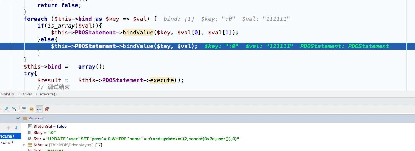 我们可以看到这里用到了bindValue,绑定一个值到一个参数,也就是把111111密码绑定到:0这里。