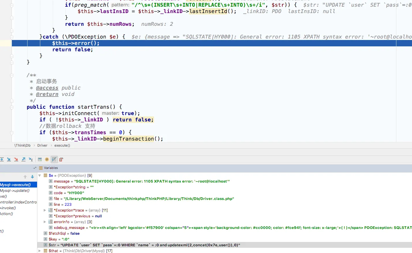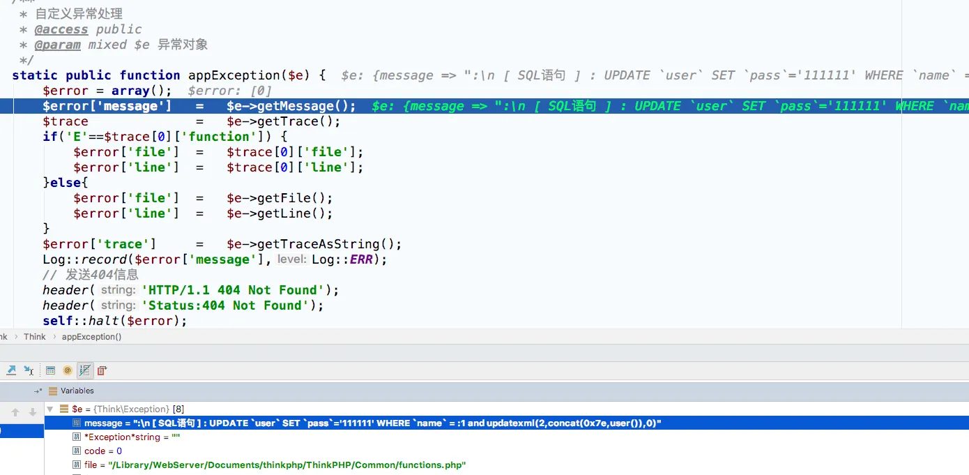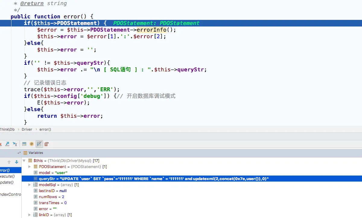 8. 继续跟下来,到SQL语句执行报错的地方,可以很清楚看到直接了我们的报错语句updatexml的值: