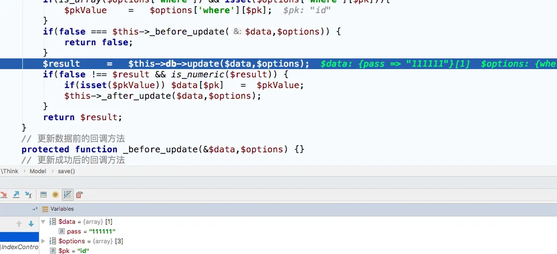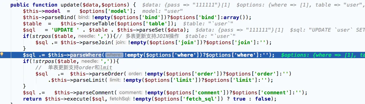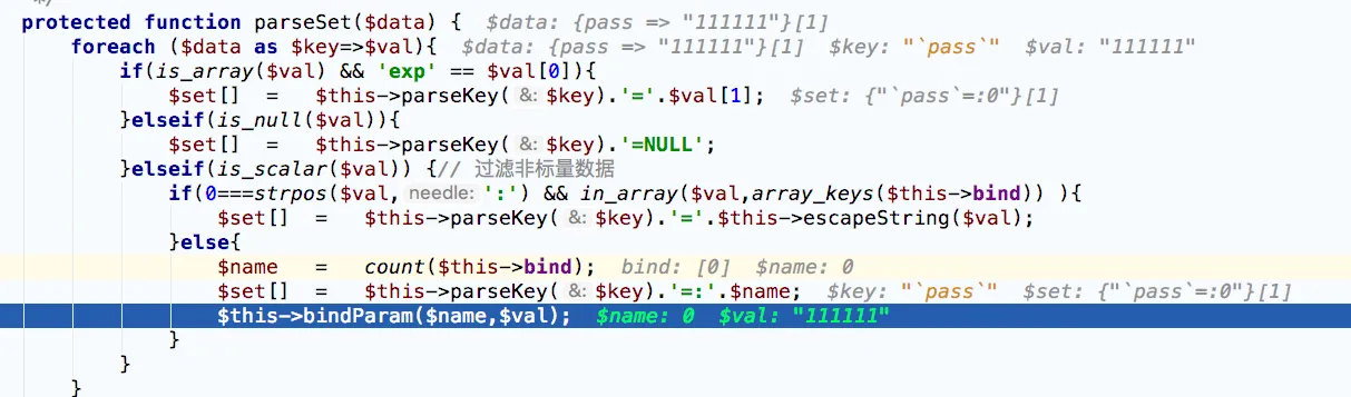 6. 从拼接这里也能看出我们为什么要把第二个数组构造的时候填0,因为是要对应上面parseSet函数,赋值了一个占位符为0,用来代替上面的密码111111,而接下来就没有这种赋值操作了,所以我们如果填其他值得话执行SQL语句的时候就会报错,到后面我会点出在哪里的。