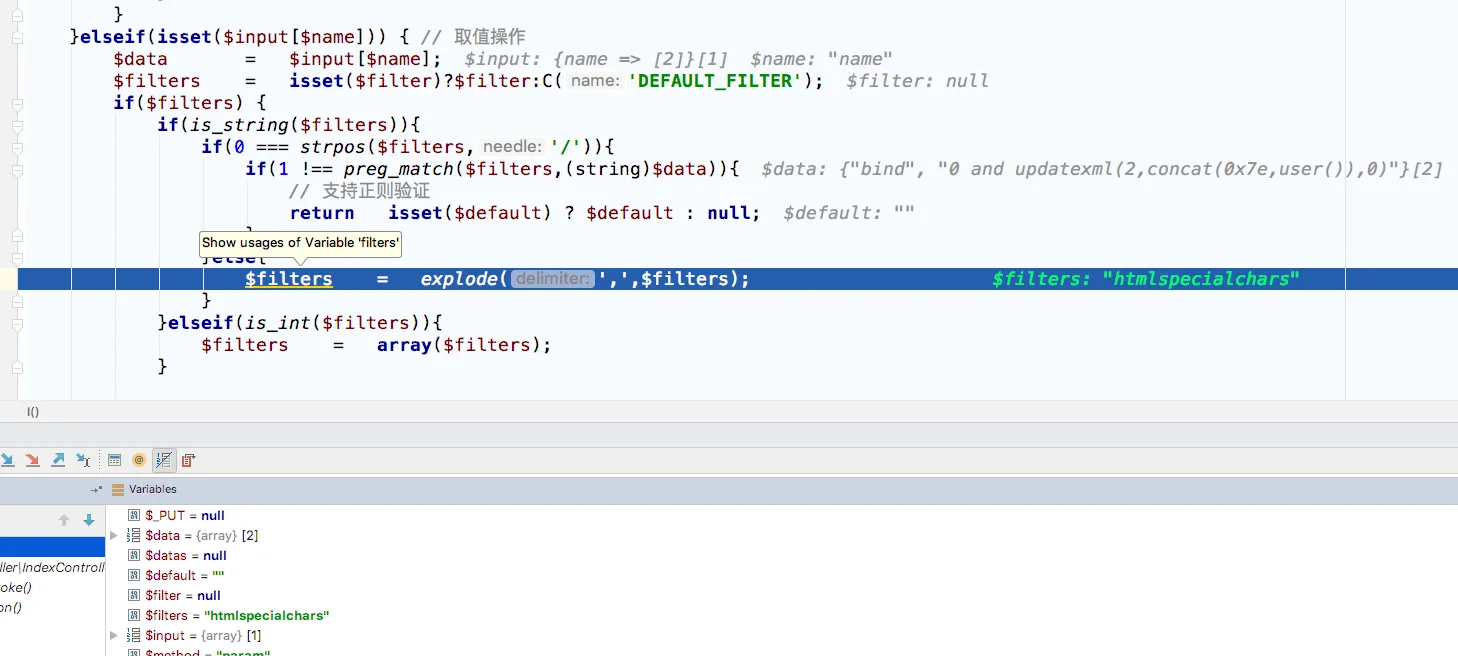 我们先在I函数这里下一个断点,看下I函数有没有过滤掉我们的输入。