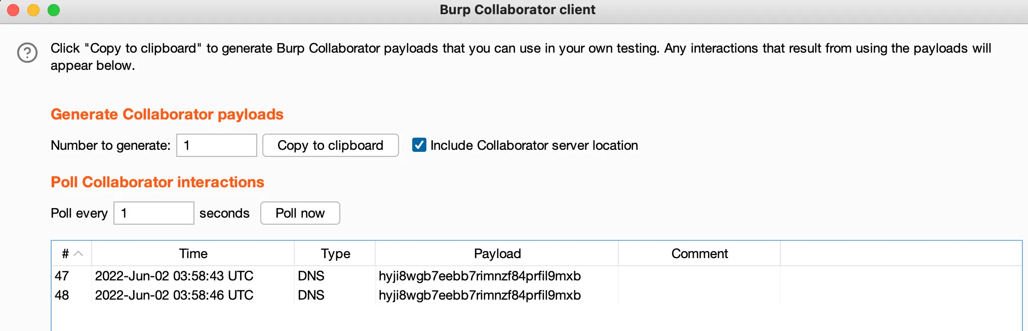 }我们来运行一下就可以发现burp上面的Collaborator记录了两条DNS的访问: