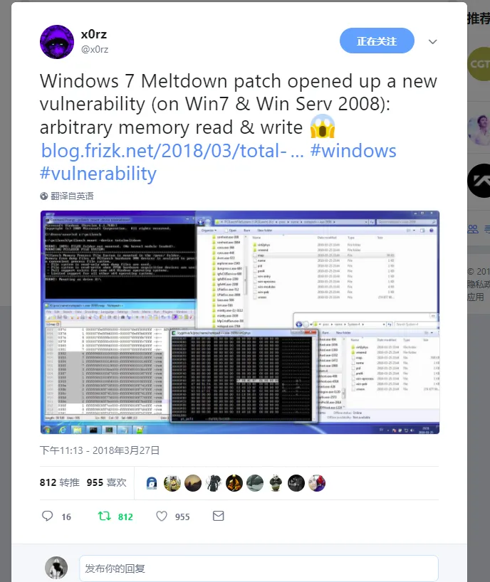 从1月份开始迎接Windows 7 Meltdown补丁。它停止了Meltdown,但是开辟了一条更糟的漏洞…它允许任何进程以每秒千兆字节的速度读取完整的内存内容,噢 - 也可以写入任意内存。