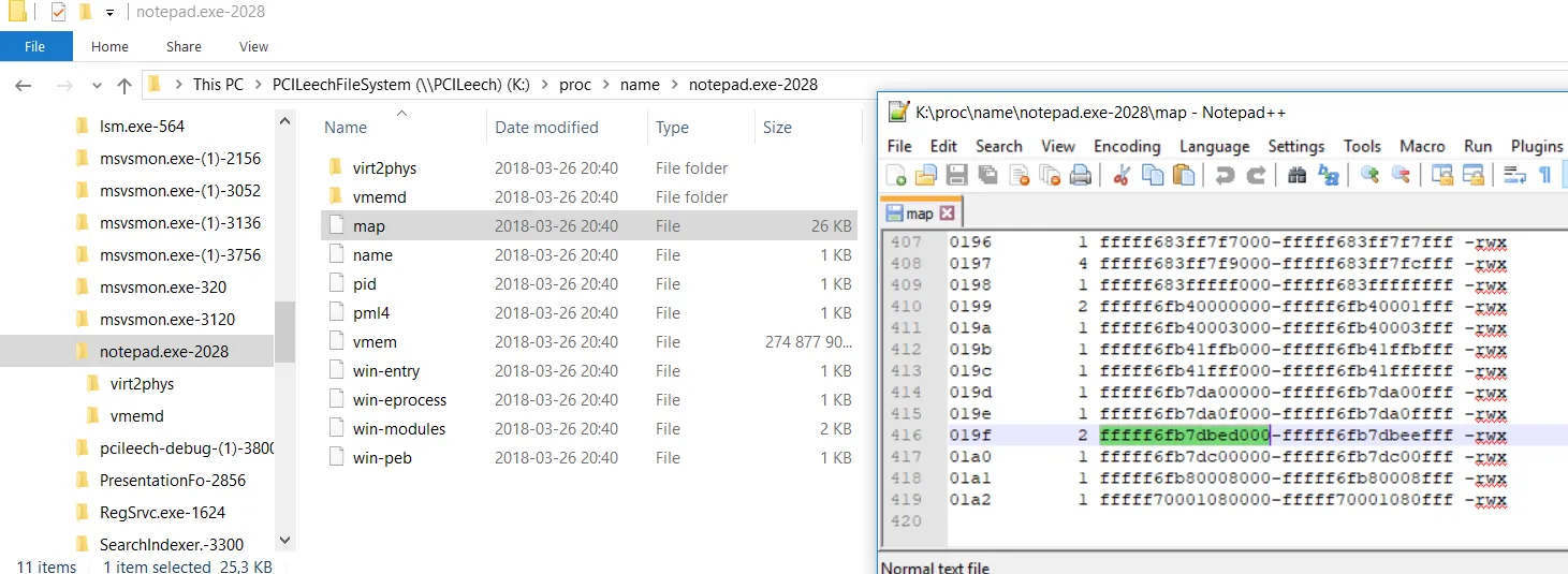 易受攻击的系统被“利用”,运行中的进程被PCILeech挂载。进程内存映射和PML4被访问。