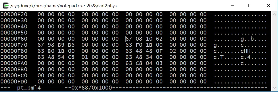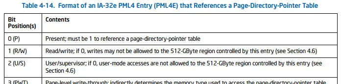 PML4e 0x0000000062100867中的最后一个’7’(来自上面的例子)表示位0,1,2被设置,这意味着它可以按照Intel手册中的说明进行存在,可写和用户模式访问。