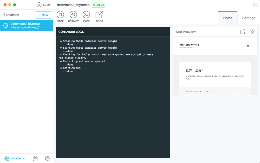 本文中用的搭建环境是docker+Kitematic,都差不多的,用图形界面比较方便些。