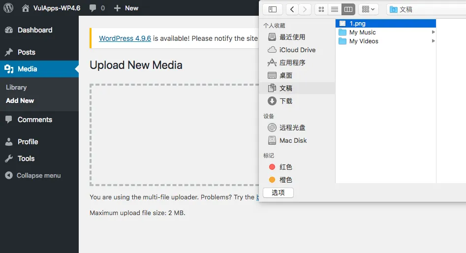 旧的和新的区别不大,只要不大于4.9.6就行了,这次测试的是4.6版本的,具体怎么搭建按照上一篇的文章方法搭建就行了,这里就不再过一遍了。 https://getpass.cn/2018/06/18/Analysis-of-WordPress%3C=4.6-Command-Execution-Vulnerability/