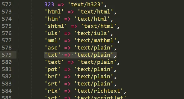 $realPath文件是否存在,接下来把$realPath赋值给$filePath,$mime = getMimetype($extension);这一句是根据参数t或者extension传过来的值决定Content-Type的可用值。getMimetype函数可以到123行查看,比如我们传过来的值$_GET['t']=txt,那么就会对应的Content-Type是: