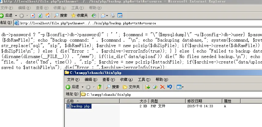 http://localhost/file.php?pathname=../../bin/php/backup.php&t=txt&o=source