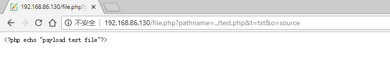 那么我们最终的Payload为: http://192.168.86.130/file.php?f=../test.php&t=txt&o=source 或者 http://192.168.86.130/file.php?pathname=../test.php&extension=txt&objectType=source