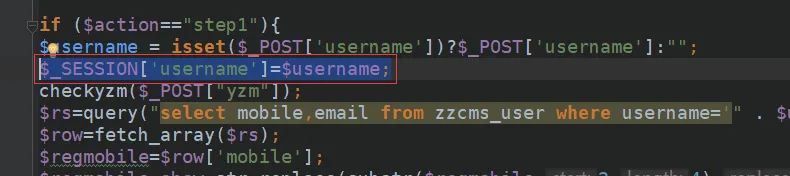 第1行,判断$action的值是否为step3和$_SESSION['username']的值是否为空,这里应该验证的是$_SESSION['username']==$username,刚才第一步post过来的用户名。