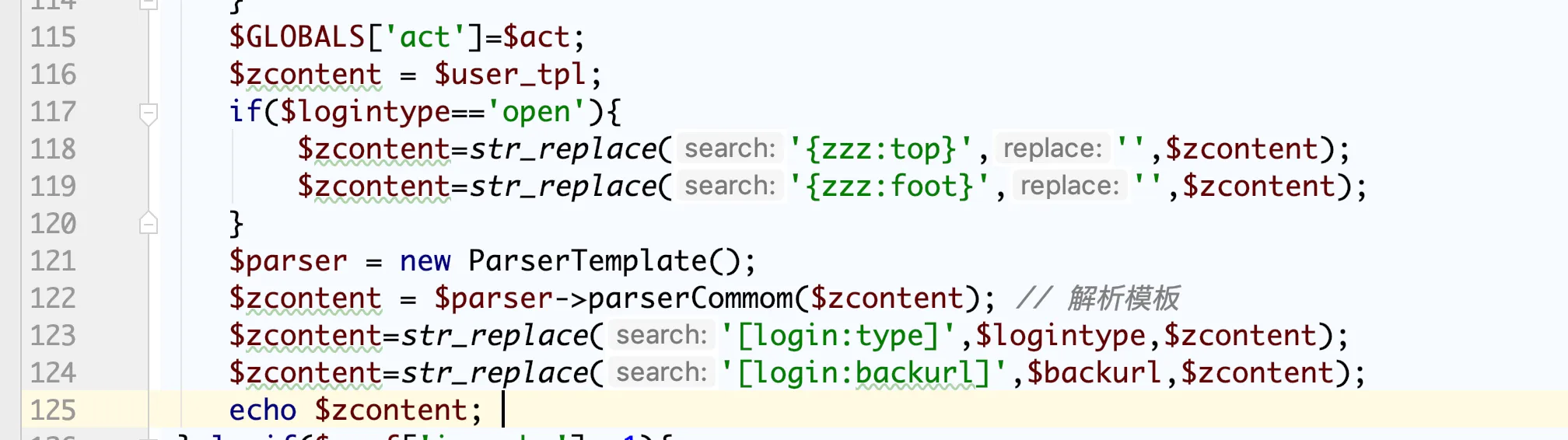 $zcontent = $parser->parserCommom($zcontent); // 解析模板