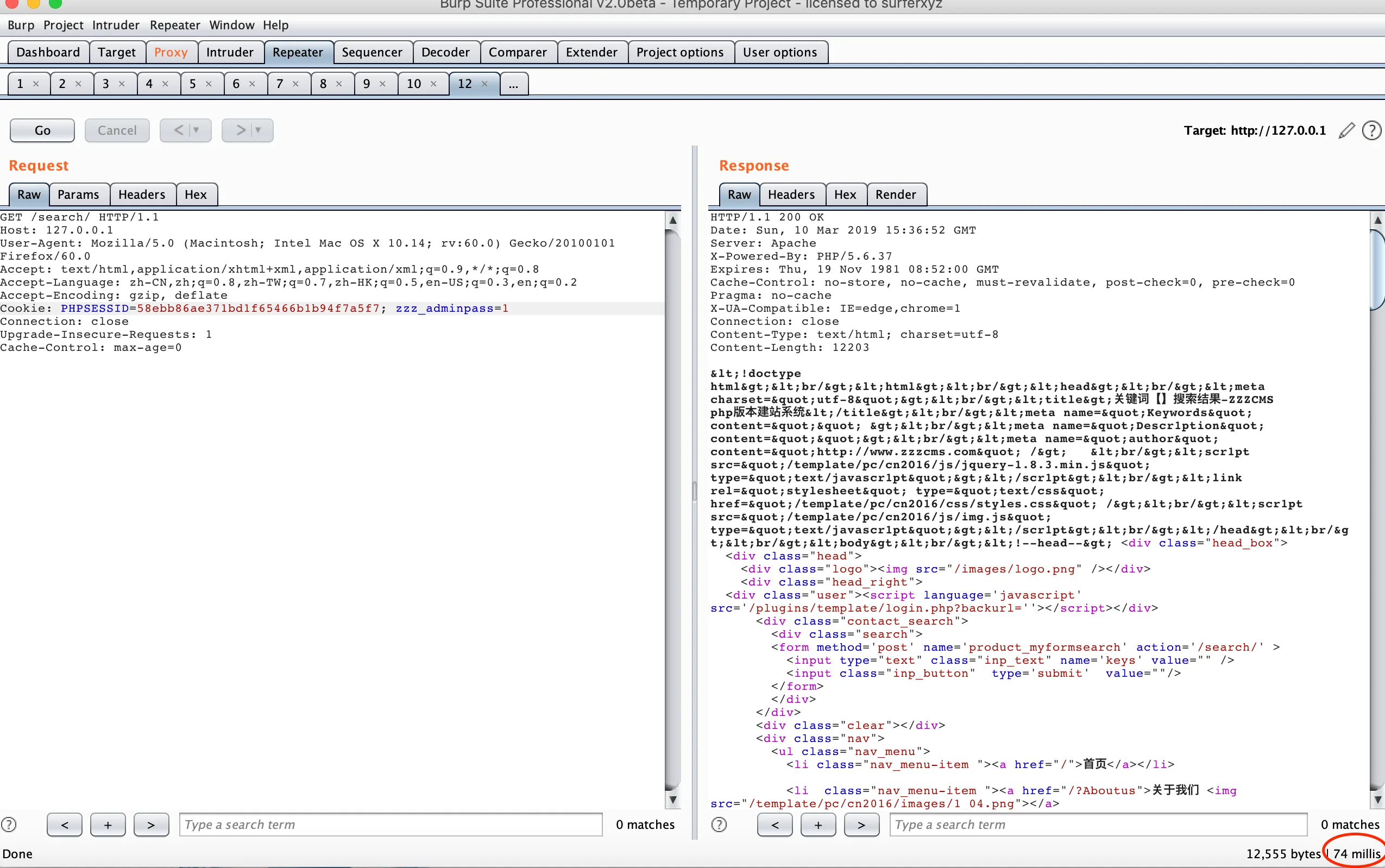 $zcontent = $this->parserSearch( $zcontent );走到inc/zzz_template.php的1561行,如果经过getform函数的话会被txt_html过滤掉,但是我们用的cookie,所以这里直接获取没有过滤。