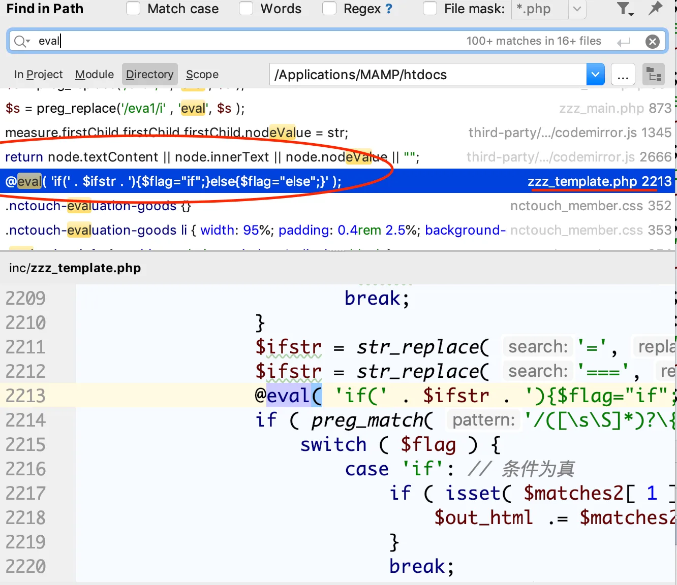 首先我们可以用seay的代码审计工具去搜索关键字执行,这个我先用了phpstorm的搜索功能找到一个eval的执行函数,然后逆过来看下从哪里可以执行这个函数,看到了在模板文件的替换函数里面